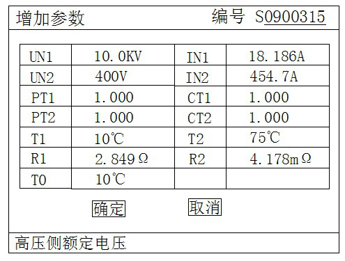 The data input method is as follows (take un1 for example, the input value is 35.00): use the direction key to move the cursor to the data input column after un1, input 35.00 directly through the numeric keypad, and press OK after input. Note that when the cursor stays in the input field after un1, the "rated voltage at high voltage side" will be prompted at the bottom of the screen (the parameter meaning of the current cursor input field will always be prompted at the bottom of the screen).