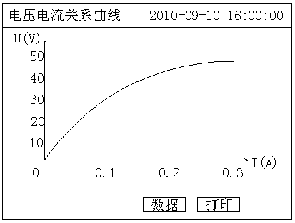 In the current interface, press the "↑" "↓" key on the keyboard to traverse the measurement results, press "save" to save the current test results to the memory of the instrument for future reference, press "print" to print the current test results through the panel printer, press "curve" key, the instrument will draw the "voltage current relationship" curve as shown in Figure 6 according to the measured data 。