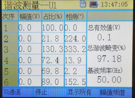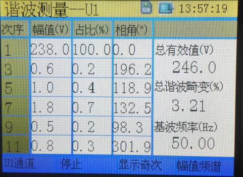 The power measurement interface shows the amplitude, proportion, phase angle, total effective value, total harmonic distortion rate (%), fundamental frequency of 1-64 harmonics of three-phase voltage and current. It can be displayed in the form of list, spectrum chart, even harmonics or odd harmonics. As shown in Figure 1.