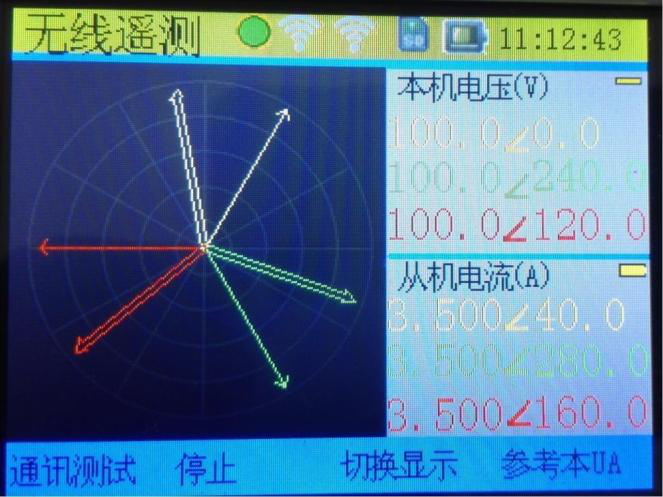 This paper introduces the wireless telemetry function of the relay protection loop vector analyzer. This function is used to measure six phase voltage and six phase current synchronously. It can select a variety of vector display, and can select native UA, IA, slave UA, ia as phase reference. It can also test the signal quality of wireless communication. The interface is as follows:
