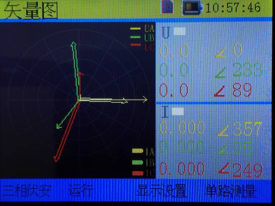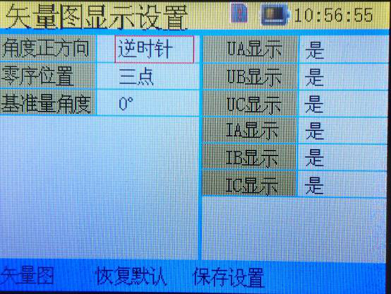 According to the user's habit, the positive direction of the angle can be set as the positive direction or the negative direction, the 0 angle can be set as the 12 point direction or the 3 point direction, and the reference amount can be set as 0 ° or 330 °. You can set whether to display UA, UB, UC, IA, IB, IC. After changing the parameter settings, you can press F3 to save the settings, or press F2 to directly return to the default setting parameters, and press F1 to return to the vector diagram interface to view the setting results.