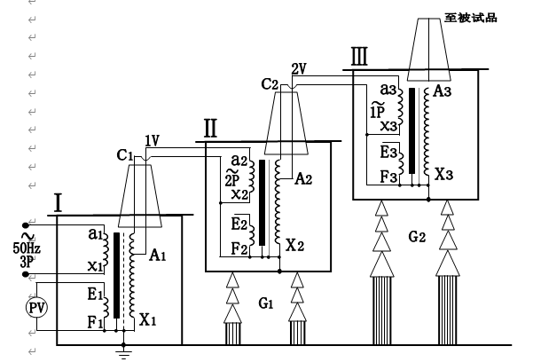 3. The wiring principle of three test transformers in series to obtain higher voltage is shown in Fig. 5. The cascade high-voltage test transformer has great advantages because the whole test device is composed of several single test transformers. The single test transformer has small capacity, low voltage and light weight, which is convenient for transportation and installation. Since it can be connected in series with the output voltage of a single test transformer several times higher, it can also be separated into several sets of single test transformer for separate use. The investment of the whole set of equipment is small and economical. In Figure 3, there is one excitation winding A1, C1 and A2, C2 in each unit test transformer of the first and second stages. In the basic principle of three series test transformers, the low-voltage power supply is added to the primary winding a1x1 of test transformer I, and the output voltage of single test transformer I, II and III is V. The excitation windings A1 and C1 supply power to the primary winding of the second stage test transformer II, and the excitation windings A2 and C2 of the second stage test transformer II supply power to the primary winding of the third stage test transformer III. The box of the second level test transformer II and the third level test transformer III are respectively at the high potential of 1V and 2V to the ground, so the box body is insulated to the ground, and the box of test transformer I is grounded. In this way, the rated output voltage to ground of the first, second and third test transformers are 1V, 2V and 3V respectively, and their rated capacities are 3P, 2P and 1P respectively.