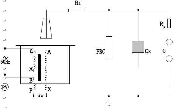 R1 - current limiting resistance FRC - resistance capacitance voltage divider RF - ball gap protection resistance G-ball gap CX - test object