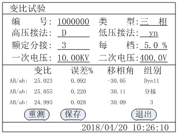 In this step-up interface, the instrument will automatically rise to the appropriate voltage according to the transformation ratio of the transformer, and test the transformation ratio, error and phase shift angle. This process will be completed within 10 seconds. If there is an error in the test process, the error message will be prompted, and the test result page will appear as shown in the figure below.