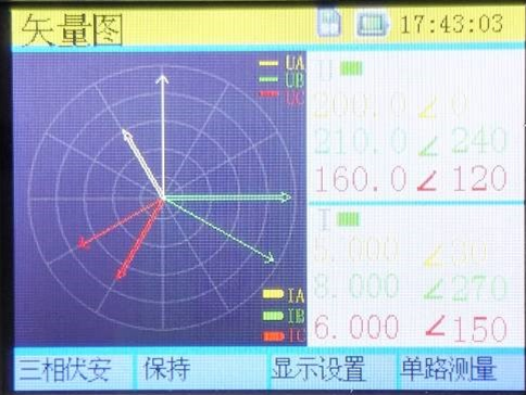 This function displays the amplitude and phase of three-phase voltage, three-phase current with vector (phasor) diagram. The magnitude of the voltage amplitude is proportional to the length of the voltage vector. The magnitude of the current amplitude is proportional to the length of the current vector. On the right side of the interface, digital display of voltage, current amplitude and phase, and automatically judge whether the voltage phase sequence and current phase sequence are correct. White block is used to indicate the magnitude of amplitude, and the phase sequence cannot be determined. Red block is used to indicate phase sequence error, and green block is used to indicate correct phase sequence. All vectors are referenced by UA, and the interface is shown in Figure 1.