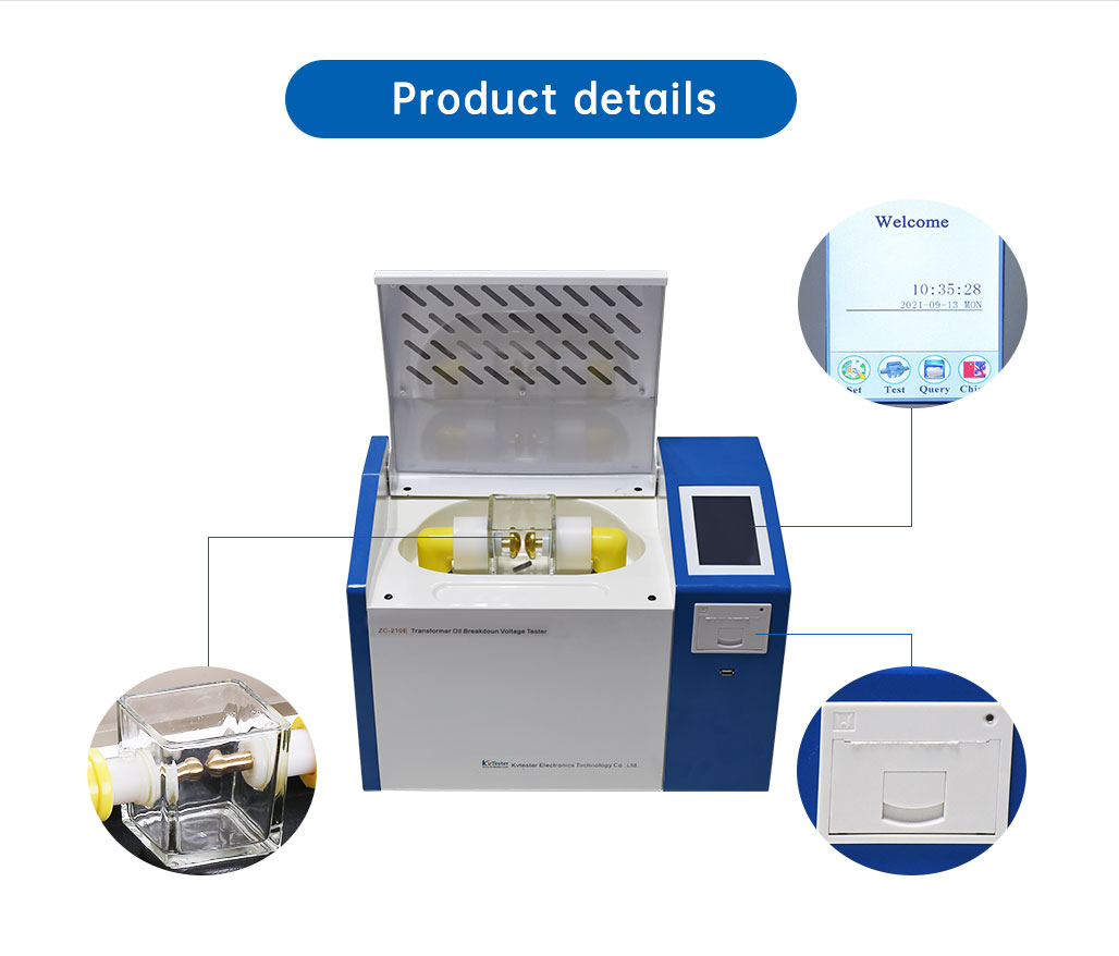 3. Simple operation. The machine will automatically complete the withstand voltage test on one cup of sample oil after simple setting by the operator. Breakdown voltage value of 1 to 9 times and recurrent times will be automatically saved. After the test, the thermal printer will print each breakdown voltage value and average value.