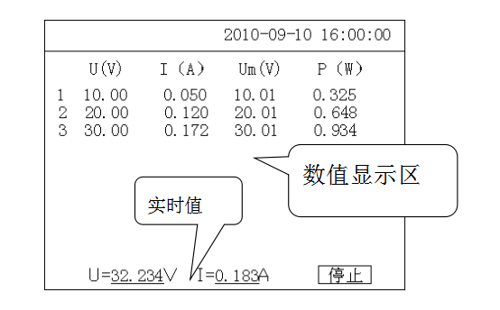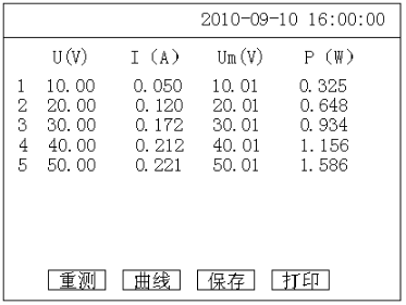 In the current interface, press the "↑" "↓" key on the keyboard to traverse the measurement results, press "save" to save the current test results to the memory of the instrument for future reference, press "print" to print the current test results through the panel printer, press "curve" key, the instrument will draw the "voltage current relationship" curve as shown in Figure 6 according to the measured data 。