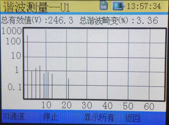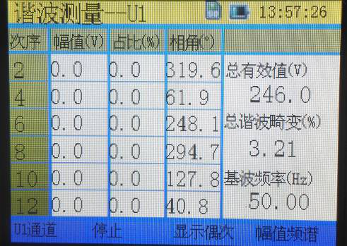 The power measurement interface shows the amplitude, proportion, phase angle, total effective value, total harmonic distortion rate (%), fundamental frequency of 1-64 harmonics of three-phase voltage and current. It can be displayed in the form of list, spectrum chart, even harmonics or odd harmonics. As shown in Figure 1.