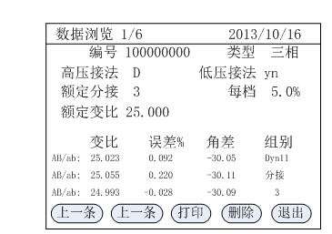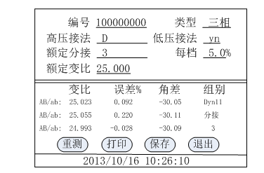 1) Transformation ratio test: in this menu, the transformation ratio, error and angle difference of single-phase transformer and three-phase transformer can be measured.