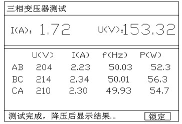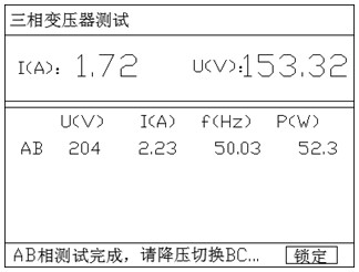 For three-phase transformer, it is necessary to measure the AB, BC and Ca windings respectively and record the measurement results for three times. For example, when the AB phase result locking test is completed, the prompt of switching phase as shown in Figure 5 will be displayed. At this time, the voltage should be reduced, and then BC phase should be connected according to the wiring diagram, and the voltage rise test should be continued. The three measurements should make the applied current consistent as much as possible. In the third measurement, the instrument cannot be shut down or exit the three-phase test interface. At the bottom of the screen, the current instrument test phase is displayed. When the final test is completed, the measurement completion as shown in Figure 6 will be displayed
