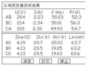 After the three-phase measurement of the three-phase transformer is completed, the instrument automatically displays the calculated short-circuit impedance measurement results, as shown in Fig. 7.