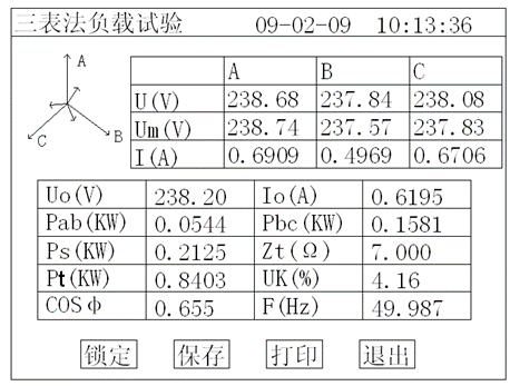 The upper left side is the vector diagram of test voltage and current. If the wiring is wrong, the page will prompt "wiring error please shut down and check"; slowly increase the test voltage through the voltage regulator, and stop boosting when Io (A) is equal to the test current of load test. Move the cursor to the "lock" button, and press the OK key for a long time. At this time, keep the voltage regulator still. When the prompt message of measuring in Figure 3 disappears, the current test result has been locked, and then the "lock" button becomes the "retest" button. At this time, please quickly operate the voltage regulator to depressurize to zero.