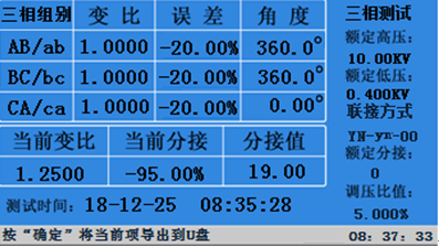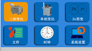 The above figure shows the startup interface, where you can select three-phase test, single-phase test, Z-type transformer test, file record, clock setting, system setting, etc;