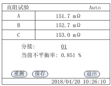 After all three-phase tests are completed, the DC resistance test results as shown in the following figure are displayed: