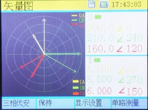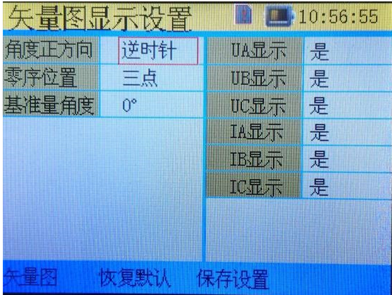 In this interface, the angle, positive direction, zero sequence position, reference angle, and whether to display UA, UB, UC, IA, IB, IC vectors can be realized. The interface is shown in Figure 5. Use the ←, → keys to move to the item to be changed, and use ↑, ↓ keys to change the item options.