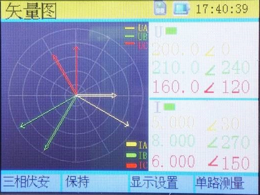 This function displays the amplitude and phase of three-phase voltage, three-phase current with vector (phasor) diagram. The magnitude of the voltage amplitude is proportional to the length of the voltage vector. The magnitude of the current amplitude is proportional to the length of the current vector. On the right side of the interface, digital display of voltage, current amplitude and phase, and automatically judge whether the voltage phase sequence and current phase sequence are correct. White block is used to indicate the magnitude of amplitude, and the phase sequence cannot be determined. Red block is used to indicate phase sequence error, and green block is used to indicate correct phase sequence. All vectors are referenced by UA, and the interface is shown in Figure 1.