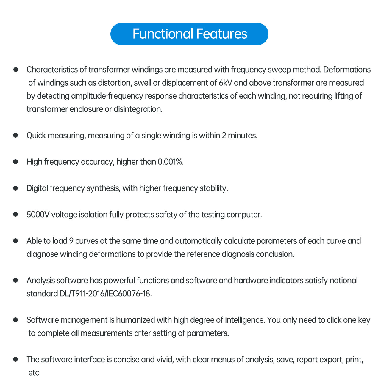 7、Analysis software has powerful functions and software and hardware indicators satisfy national standard DL/T911-2016/IEC60076-18.
