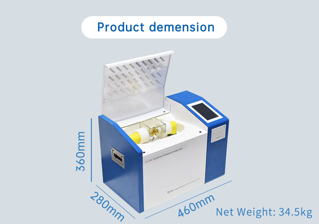 3. Simple operation. The machine will automatically complete the withstand voltage test on one cup of sample oil after simple setting by the operator. Breakdown voltage value of 1 to 9 times and recurrent times will be automatically saved. After the test, the thermal printer will print each breakdown voltage value and average value.